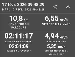 Allure environ 5 kms/h. pauses comprises.